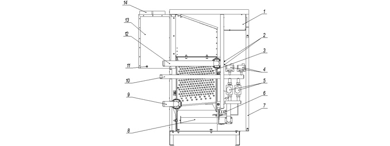 8. Горелка 9. Патрубок для подключения обратного трубопровода 10. Патрубок подачи газа 11. Датчик тяги 13. Прерыватель тяги 14. Патрубок для подсоединения к дымоходу |