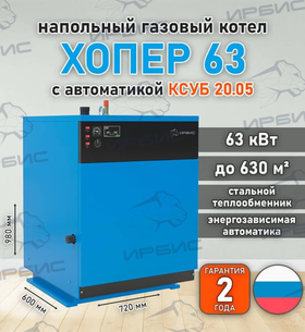 Напольный газовый котел «Хопер 63» с автоматикой КСУБ 20.05 предназначен для водяного отопления жилых, промышленных, складских и прочих помещений площадью до 630 м².